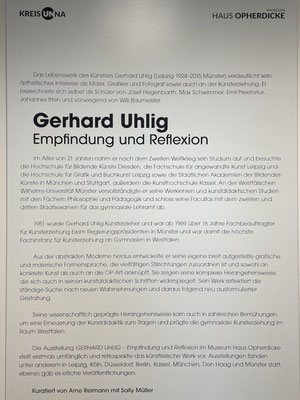 Hieran zeigt sich auch das didaktische Bestreben Gerhard Uhligs. Nach seinem Kunststudium – u.a. bei Johannes Itten und Willi Baumeister – unterrichtete er seit den 1950er Jahren als Gymnasiallehrer Kunst und nicht nur das: Von 1969 bis 1985 war er als Fachbeauftragter für Kunsterziehung im Regierungsbezirk Münster zuständig für die Kunstlehre und -ausbildung, leitete die Lehrerfortbildungen und prägte die Richtlinien für Kunsterziehung in Nordrhein-Westfalen.