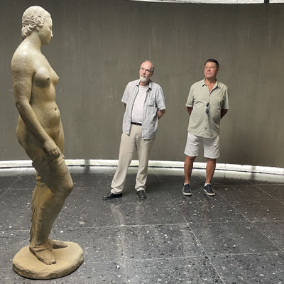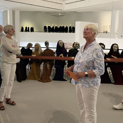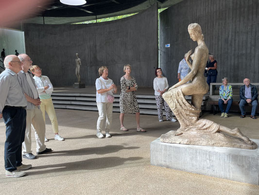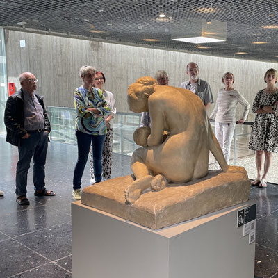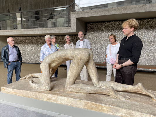 Als dritten Höhepunkt verschaffte uns der kundige Kunsthistoriker, der uns führte, einen sehr erhellenden Überblick über die Entwicklung des Namensgebers des Museums, Wilhelm Lehmbruck: Zunächst am Ideal der griechischen Antike ausgerichtet, wurden seine Figuren seit etwa 1911 immer expressionistischer, abstrakter, mit gelängten Gliedmaßen; seit den niederschmetternden Eindrücken des Ersten Weltkriegs gebeugt, gestürzt. 1919 nahm er sich das Leben.