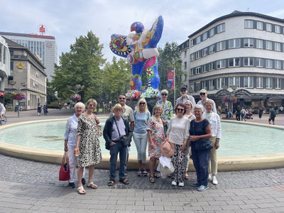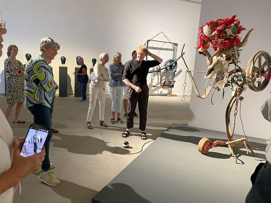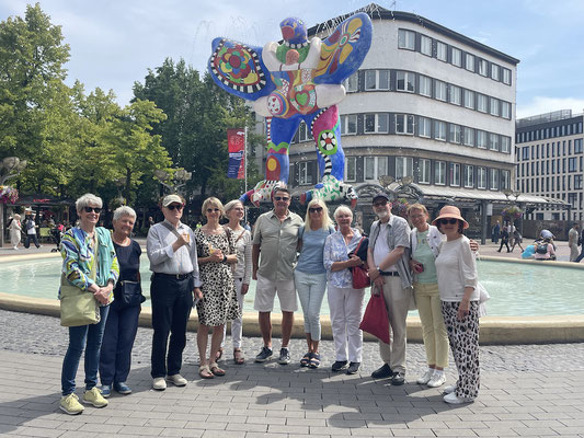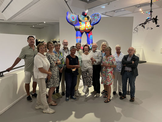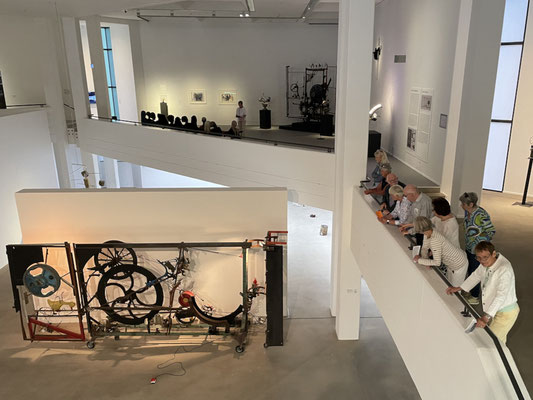 Vorweg, als ersten Höhepunkt, schauten wir uns den Life Saver in der Duisburger „Brunnenmeile“ an. Niki de Saint Phalle, die zweite Ehefrau von Tinguely, hatte ihn als Gemeinschaftsarbeit mit ihrem Mann geschaffen. Das Modell schenkten sie dem Lehmbruck-Museum, wo es aktuell ausgestellt ist und wir es in Augenschein nehmen konnten.