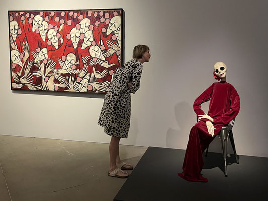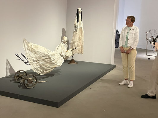 Ganz anders die mehr introvertierte Eva Aeppli, Tinguelys erste Frau, mit der er zwar nur bis 1960 zusammenlebte, jedoch bis zu seinem Tod freundschaftlich zusammenarbeitete. Die meisten ihrer hier zu sehenden Werke sind Stoffpuppen verschiedener Größen, meist aus Samt, Seide, Leder, gefüllt mit Kapok und bis hin zu den langen Fingern, Lippen, Augenbrauen, Falten komplett handgenäht. Androgyne Figuren. Gruselig sind die Gesichter, von Schmerz geprägt, die Münder zum Schrei geöffnet. Obgleich der Tod allgegenwärtig erscheint, findet man auch Elemente voller Komik.